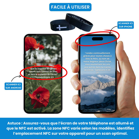 Notre bracelet est conçu avec une technologie NFC, en le scannant vous recevrez chaque jour un nouveau verset choisi par nos soins. Cliquez ici pour voir un tuto : comment fonctionne le bracelet.